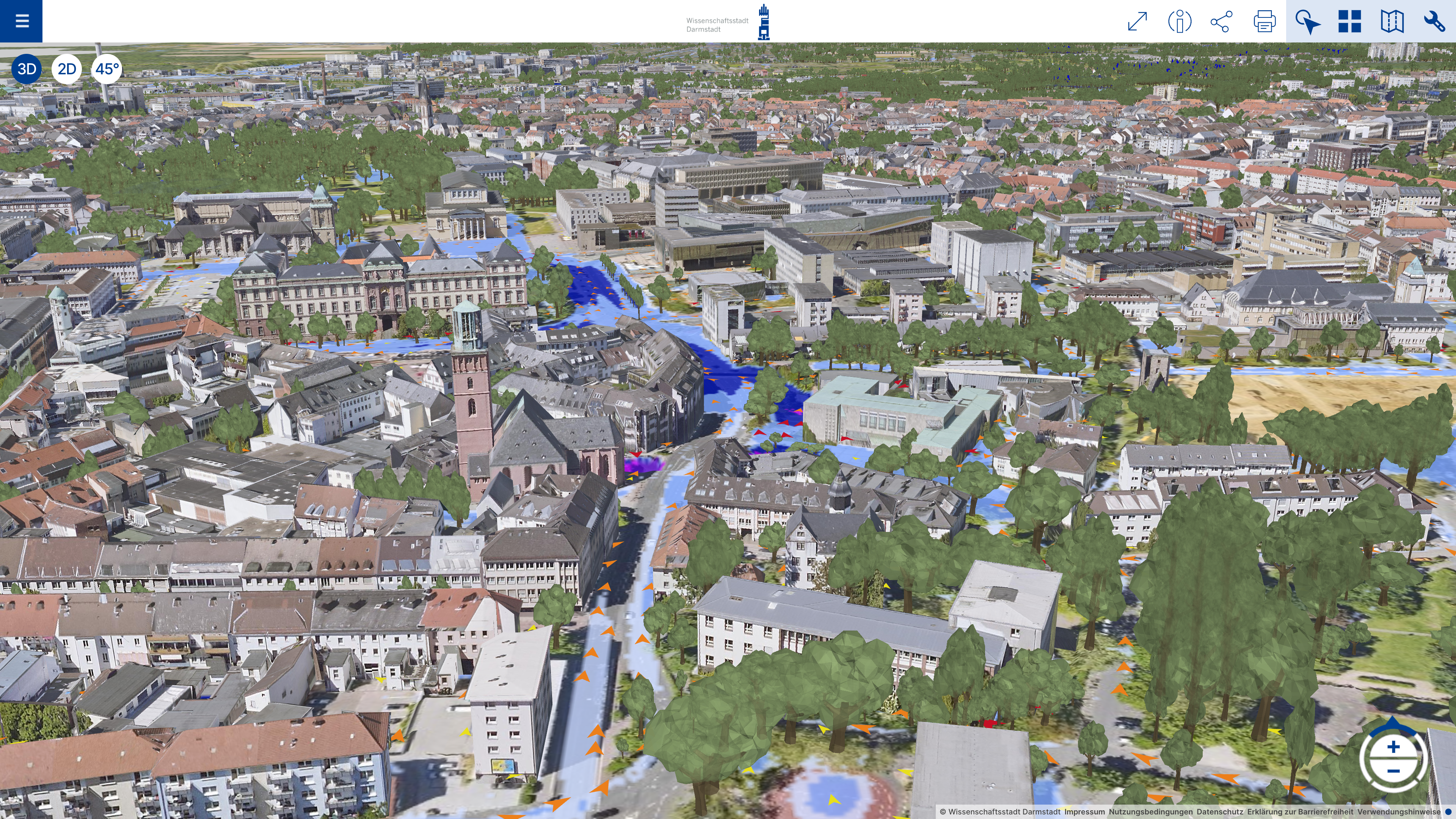 Ein erstes Anwendungsbeispiel ist die Starkregengefahrenkarte, die im Auftrag des Amts für Klimaschutz und Klimaanpassung entwickelt wurde und zusätzlich unter 3d.darmstadt.de/v/Starkregen verfügbar ist.