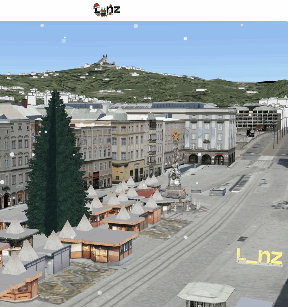 Neben einer eindrucksvollen 3D-Darstellung des Linzer Weihnachtsmarktes lässt es die Stadt Linz im Viewer schneien (Tipp: Suchen Sie nach “snow“ unter “Tools” in den View-Einstellungen).